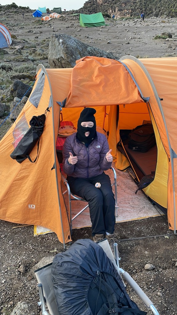 Woohoo, we arrived at the cloudy Karanga Camp at midday! I collapsed into our tent (btw, the porters are just amazing – they leave camp after you, pack everything up, overtake you on the trek, then set your tent up for your arrival including a tray of warm fresh popcorn & nuts, hot water for drinks, and a bowl to wash your grubby paws in).