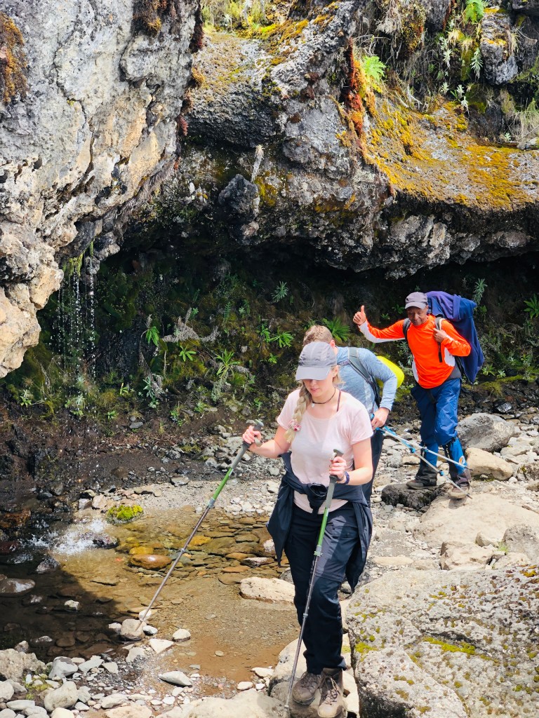 Cold and tired we reluctantly put on our cold, damp clothes (which stunk of fire and were covered in smoky black marks) and sopping wet shoes and began the steep trek at 8am. Day 2 had us passing through the Moorland zone – trekking up rocky pathways and scrambling with our hands over big boulders.