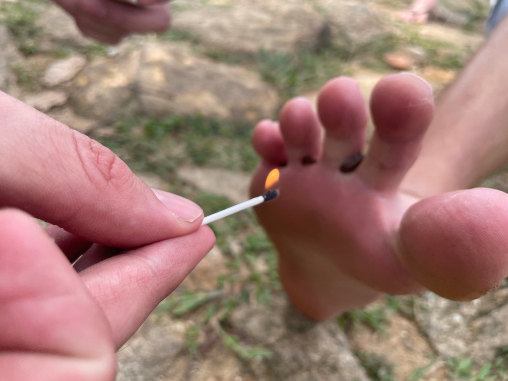 Just after the above photo was taken, James was brutally attacked by three leeches. Right in between his toes. Ewww. Someone had heard that fire is a good idea (?) to get them to detach, so that was the plan. Aran separated the toes whilst I filmed the others torch the leeches in between the toe gaps. Which did work, although sadly toes were charred in the process.