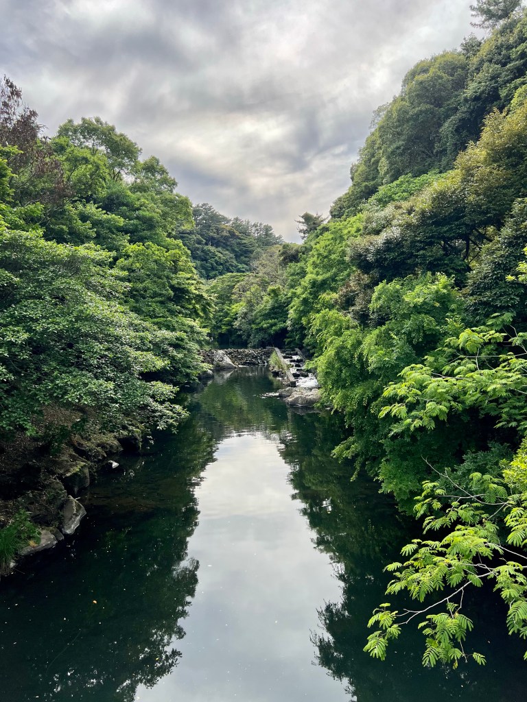 The second one we visited was Cheonjiyeon; which translates as “sky connected with land”. To get to this waterfall, we walked along a pretty 1km trail, stopping to throw coins over the bridge into the river as it is said to bring good luck.