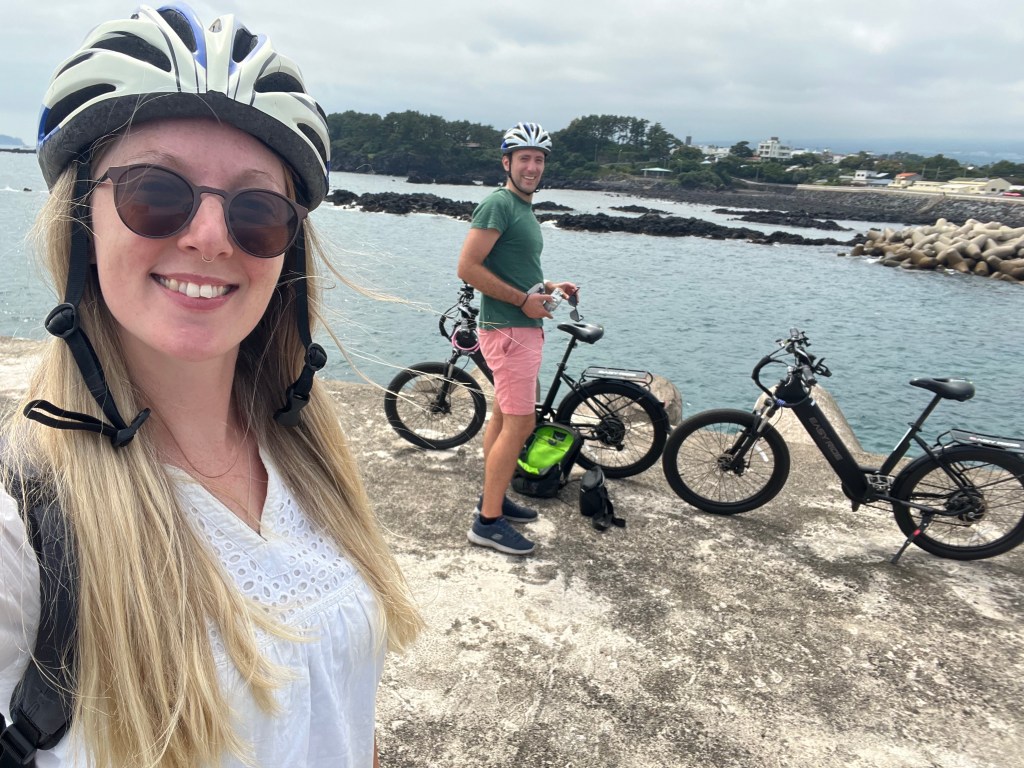 As public transport isn’t that developed on Jeju, one day we hired e-scooters and scooted to two of Jeju’s most famous waterfalls.