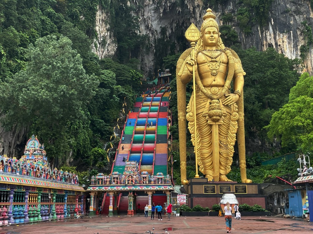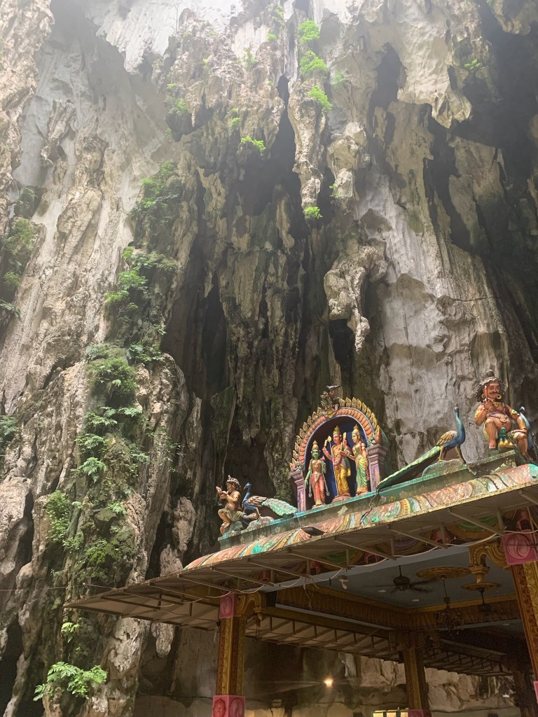 Batu Caves are home to one of the most important Hindu shrines in the world: a homage to Lord Murugan. It was just us tourists and Mark from Melbourne, so we joined forces, and climbed up the colourful stairs to stroll around this impressive cave temple.